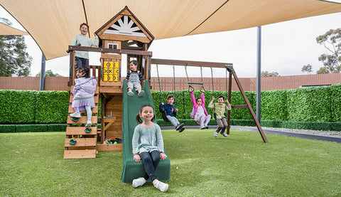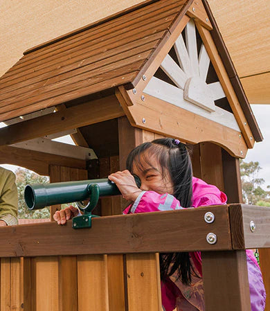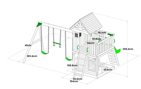 This spacious wooden Coventry Play Set is a gorgeous and feature packed addition to every backyard or outdoor play space. This timber play centre is complete with a large roofed raised timber cubby playhouse with balcony, a 2.2m wavy green slide, rock climbing wall, double swing set with trapeze and lower cubby with picnic table and benches, there is also an in-built toy kitchen and space beneath for a sandpit or ball pit.