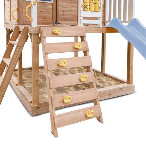 The raised wooden Warrigal cubby house with pastel blue slide from Lifespan Kids is the perfect all-rounder for every Aussie backyard. Featuring a climbing wall, 2.2m wave slide, ladder, spacious cubby with veranda and built-in sandpit underneath. A bestseller guaranteeing years of creative outdoor fun.