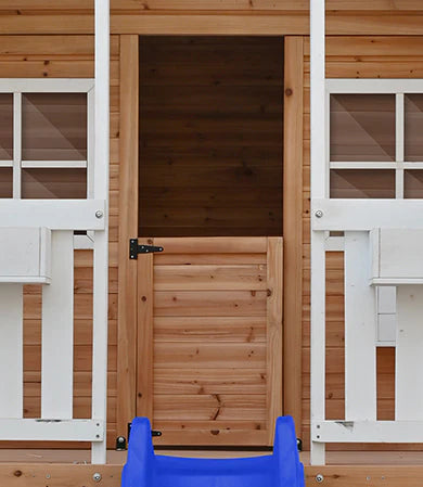 Built to withstand the elements and provide lasting shelter, the Winchester Cubby House features a durable metal roof, ensuring wear resistance, and allowing for year- round outdoor play in any weather.