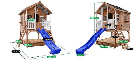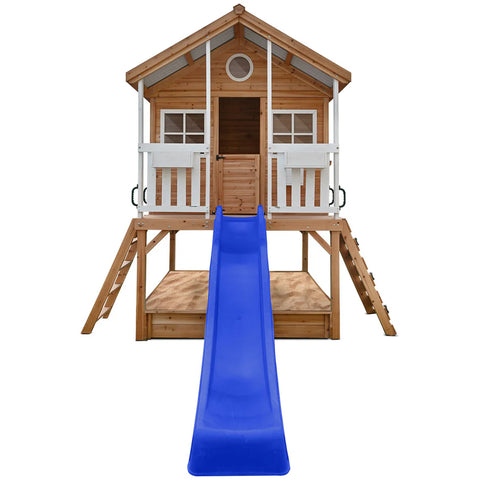Lifespan Kids' Winchester impressive 1.2m raised wooden outdoor cubby house with 2.2m blue slide is every child's dream wonderland playhouse. Packed with features including a steel corrugated roof, elevated play house with enclosed windows, 2.2m wavy slide, climbing wall, ladder plus sandpit beneath - this is an Aussie bestseller and the ultimate outdoor raised cubby!